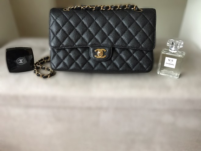 Chanel Medium Flap in Caviar leather. Chanel Nos5 L’eau. Chanel blusher.